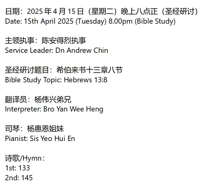 常年灵修暨佈道会~ANNUAL SPIRITUAL NURTURE cum EVANGELICAL MEETING (2025/05/31-06/02) - May 05, 2025 Read more